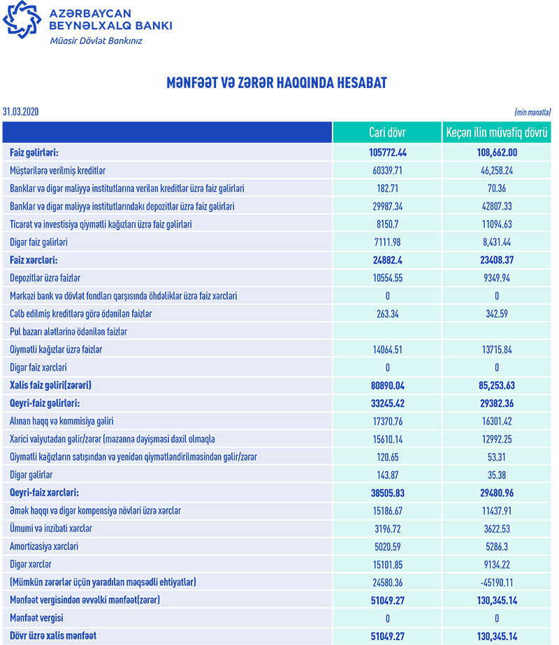Marja Bankın maliyyə göstəricilərinə istinadən xəbər verir ki, 2020-ci ilin yanvar-mart dövründə Azərbaycan Beynəxalq Bankının cəmi əməliyyat gəlirləri 139 milyon 17 min manat, cəmi əməliyyat xərcləri isə 63 milyon 388 min manat təşkil edib. Gəlirlər xərcləri üstələdiyindən Bankın 75 milyon 630 min əməliyyat mənfəəti yaranıb. Əməliyyat mənfəətindən 24 milyon 580 min manat mümkün zərərlər üçün yaradılan məqsədli ehtiyatlara ayrılıb və nəticədə Beynəlxalq Bank ilk rübü 51 milyon 50 min manat xalis mənfəətlə başa vurub.