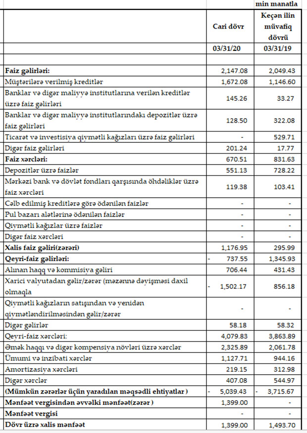 Müqayisə üçün qeyd edək ki, 2019-cu ilin ilk rübündə VTB Azərbaycan-ın cəmi əməliyyat gəlirləri 3 milyon 394 min manat, cəmi əməliyyat xərcləri 5 milyon 617 manat, əməliyyat zərəri 1 milyon 300 min manat təşkil etmişdi. Əvvəlki illər yaradılmış mümkün zərərlər üçün yaradılan məqsədli ehtiyatdan 3 milyon 715 min manatın azad olması hesabına həm əməliyyat zərəri bağlanmışdı, həm də Bankın1 milyon 494 min manat xalis mənfəəti qalmışdı.