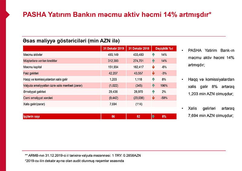 PAŞA Bank, 31 dekabr 2019-cu il tarixinə bitən il üzrə özünün və törəmə banklarının (PASHA Bank Georgia və PASHA Yatırım Bankası A.Ş.) maliyyə nəticələrini mətbuat konfransında açıqladı.