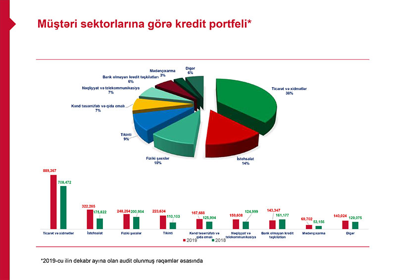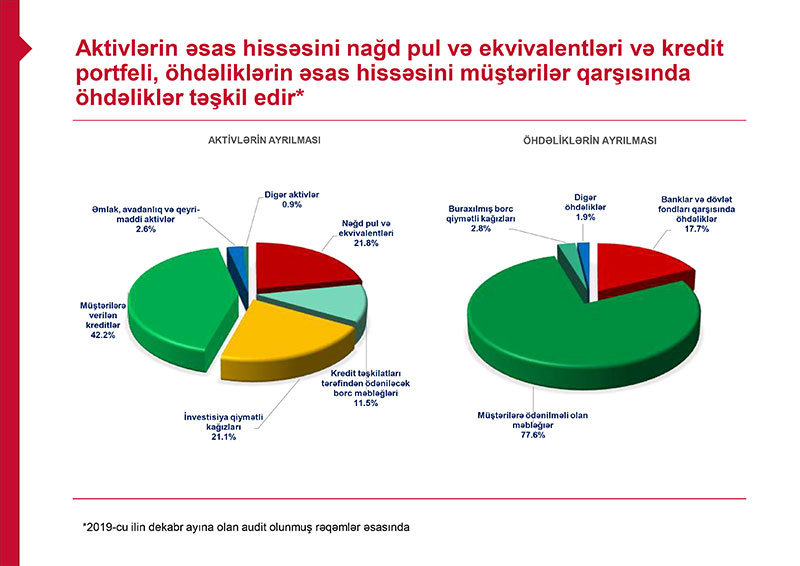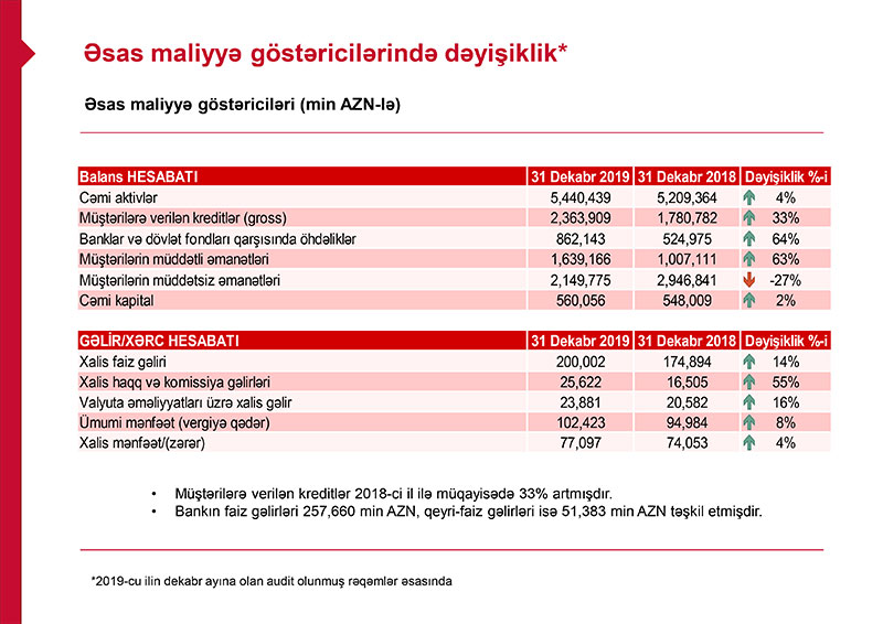 Müştəri depozitləri əsasən tələbli və müddətli hesablarda müvafiq olaraq 57% və 43 % nisbətində cəmlənmişdir (2018: 75% and 25%). Bank 2019-ci maliyyə ili üçün 77,097 min manat xalis mənfəət (2018: 74,053 min manat) elan etmişdir. Eyni dövr üçün toplam əməliyyat gəlirləri 251,385 min manat olmuşdur ki, bu göstərici keçən ilin müvafiq dövrü ilə müqayisədə 17% çoxdur (2018: 214,162 min manat). Bankın faiz gəlirləri 257,660 min manat, qeyri-faiz gəlirləri 51,383 min manat təşkil etmişdir. Nəticədə qeyri-faiz gəlirinin ümumi əməliyyat gəlirlərinə nisbəti 20% olmuşdur.