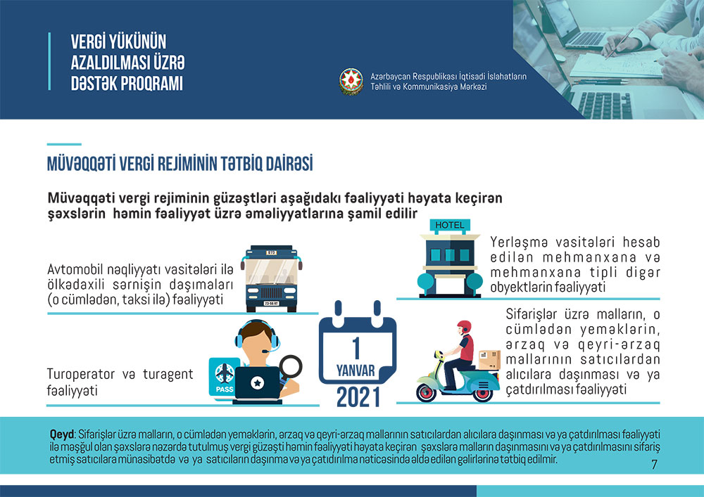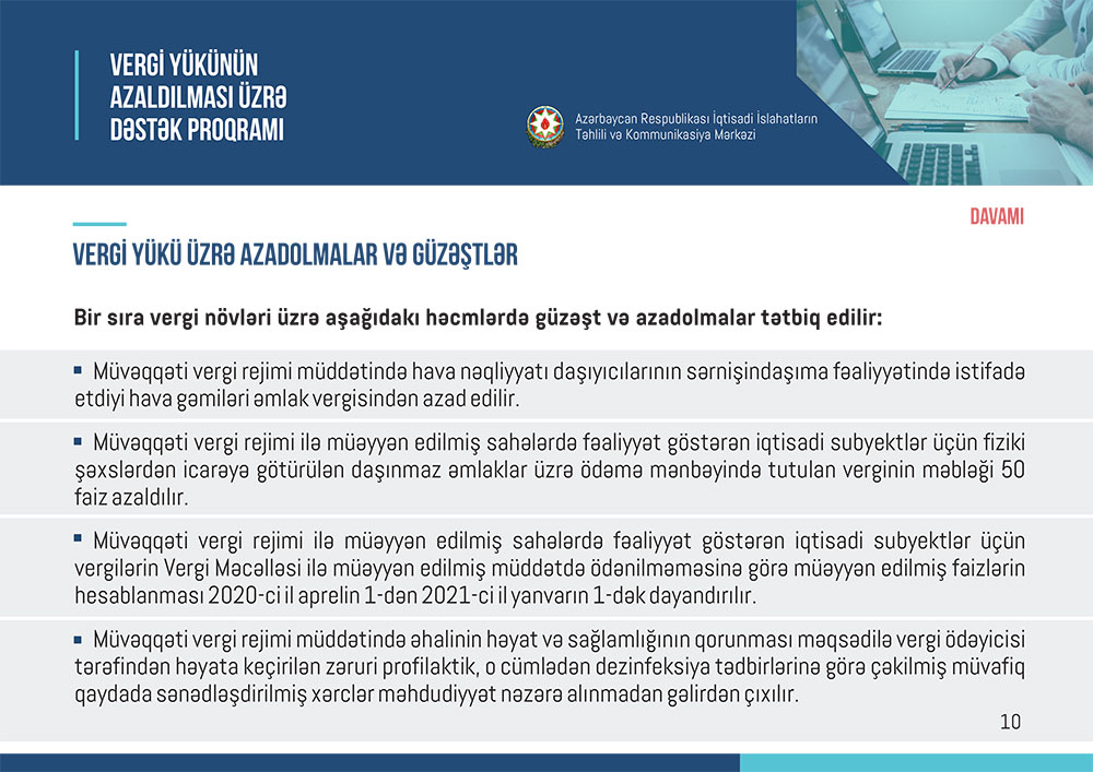 Marja xəbər verir kiI “İslahat icmalı”nda maliyyə yükünün azaldılması, vergi tətilinin verilməsi, tətbiq olunan güzəştlərin əsas təsir dairəsi, eyni zamanda qanunvericiliyə edilmiş digər dəyişiklik və əlavələr müqayisəli formada təqdim olunub.