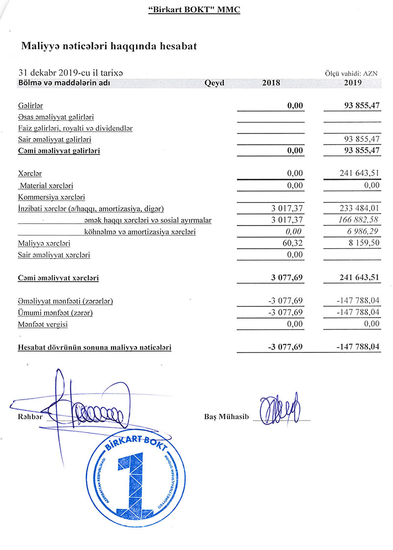 Ötən il təşkilatın cəmi əməliyyat gəlirləri 93 min 855 manat, cəmi əməliyyat xərcləri isə 241 min 643 manat təşkil edib. Xərclər gəlirləri üstələdiyindən təşkilatın 147 min 788 manat əməliyyat zərəri yaranıb. 2018-ci ildə əməliyyat gəlirləri olmayan təşkilatın zərəri 3 min 78 manat təşkil etmişdi. Ötən il təşkilatın xərclərinin artması işçilərin sayının 15 nəfərə çatdırılması ilə əlaqədar olaraq əməkhaqqı xərcinin artması ilə bağlıdır. Belə ki, 2018-ci ildə 3 min 17 manat təşkil etmiş əməkhaqqı və sosial ayırmalar xərcləri 2019-cu ildə 166 min 882 manata yüksəlib. Ötən il aktiv fəaliyyətə başlayan “Birkart BOKT”ın artan kredit portfelindən daxil olan faiz gəlirlərinin artması ilə bu il mənfəətə keçə bilər.