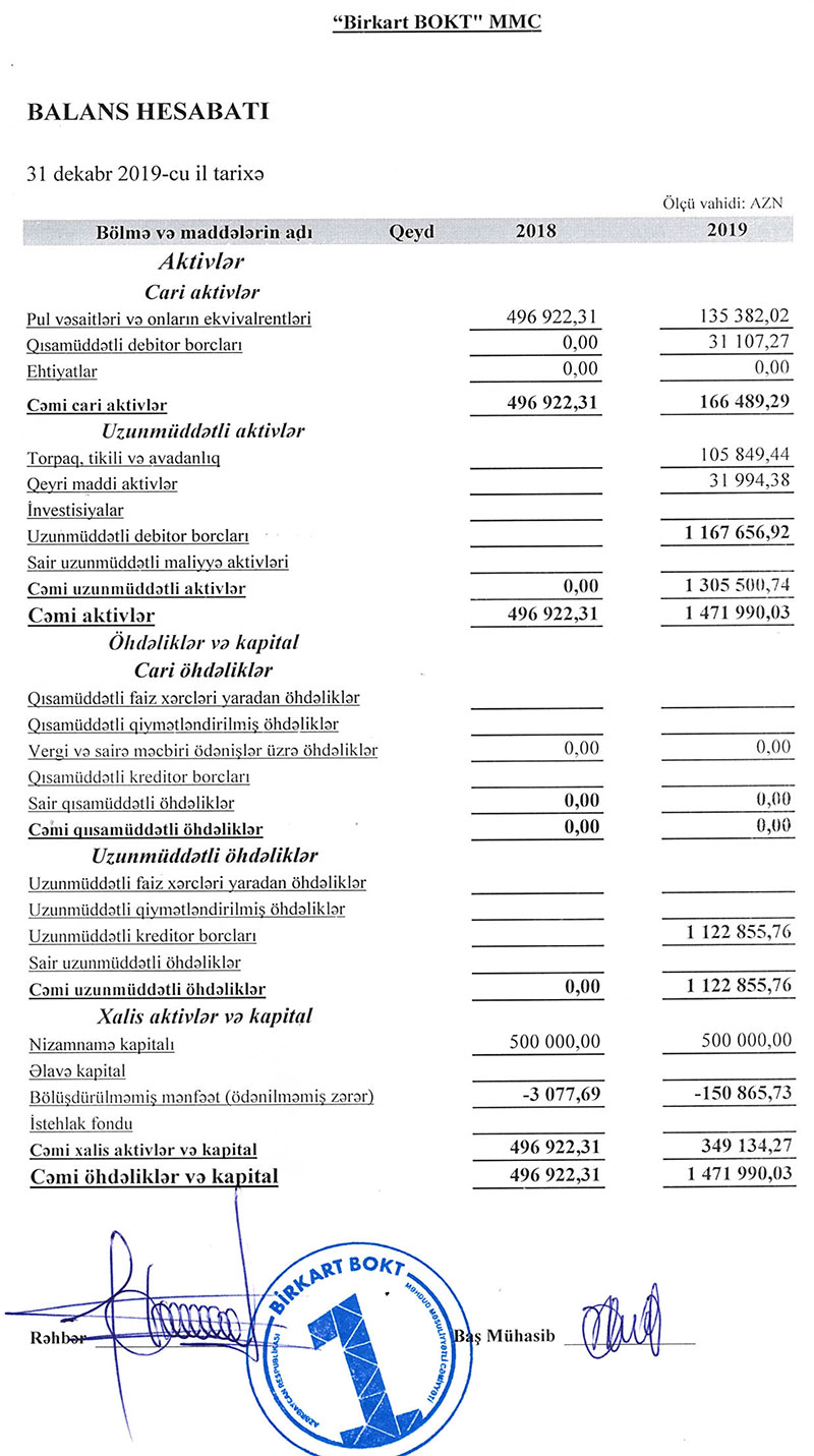 Marja hesabatlara istinadən xəbər verir ki, “Birkart BOKT” 2018-ci ildə fəaliyyətə başlasa da 2019-cu ildən aktiv fəaliyyətə başlayıb - müştərilərə kreditlər verilib, gəlirlər əldə edilib.