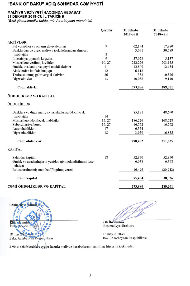 “Bank of Baku” ASC 2019-cu il üzrə Beynəlxalq Maliyyə Hesabatı Standartlarına uyğun hazırlanmış maliyyə hesabatlarını dərc edib. Hesabatdan məlum olur ki, ötən il “Bank of Baku”nun yığılmış zərəri tamamilə bağlanmış, 2018-ci ildə minimal tələbdən aşağı olmuş cəmi kapitalı 2 dəfə artaraq tələbə artıqlaması ilə cavab vermiş, Bankın biznesi aktivləşmiş, müştərilərə verilmiş kreditlər artmış, kreditlərin artması ilə bankın gəlirləri də artmışdır.XALİS MƏNFƏƏTİ KƏSKİN ARTIB
