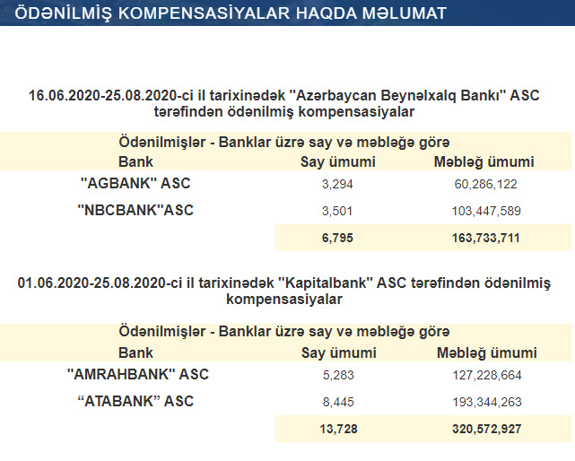24 avqust tarixinə "Atabank" ASC, "Amrahbank" ASC, "NBC Bank" ASC və "AGBank" ASC-nin əmanətçilərinə 484 milyon 306 min manat 638 manat kompensasiya ödənilib.