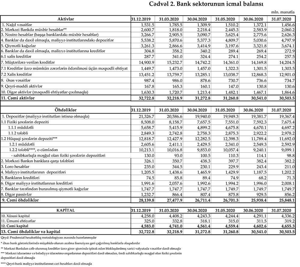Mərkəzi Bank 31 iyul 2020-ci il tarixinə olan bank sektorunun əsas göstəricilərini açıqladı.