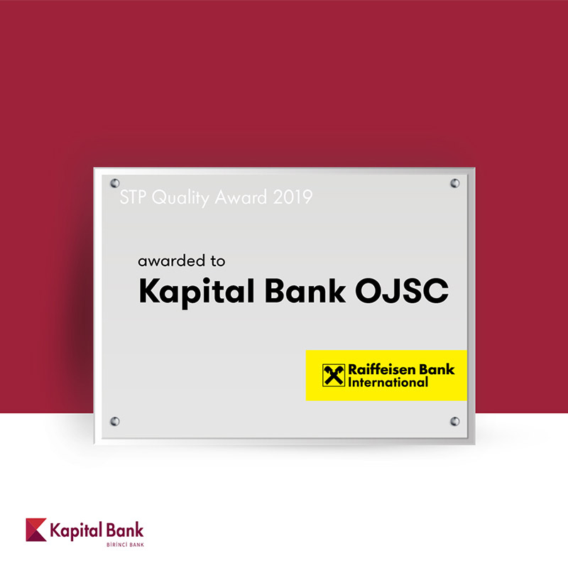 Kapital Bank Raiffeisen Bank International tərəfindən mükafatlandırılıbKapital Bank dünyanın nüfuzlu maliyyə qurumlarından olan Raiffeisen Bank International AG tərəfindən “STP Quality Award 2019” mükafatı ilə təltif edilib. Bu mükafat beynəlxalq ödənişləri yüksək keyifyyətlə icra edən banklara təqdim olunur.