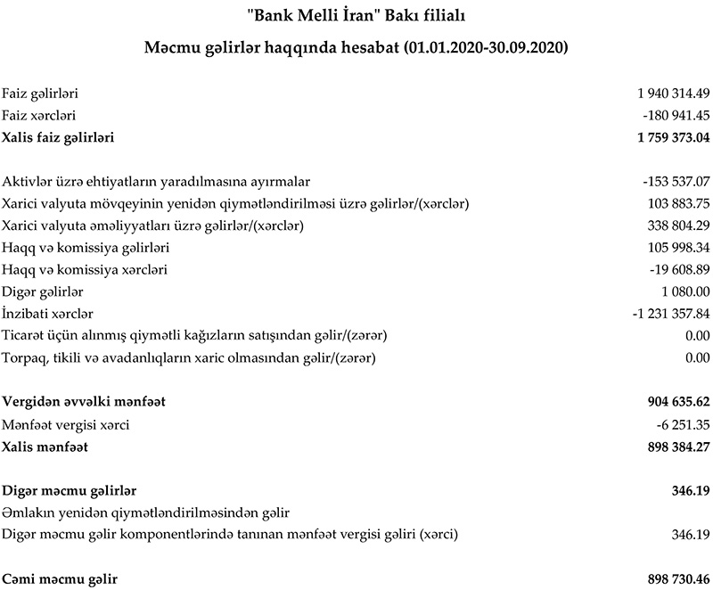 2020-ci ilin yanvar-sentyabr dövründə “Bank Melli İran" Bakı filialının cəmi gəlirləri 2 milyon 490 min 79 manat, cəmi xərcləri 1 milyon 585 min 443 manat, əməliyyat mənfəəti 904 min 636 manat təşkil edib. Filial 6 min 251 manat mənfəət vergisi ödəyib.