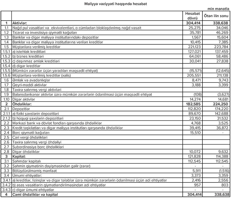 Bankda depozitlər isə 174 milyon 220 min manatdan 112 milyon 820 min manat geriləyib.