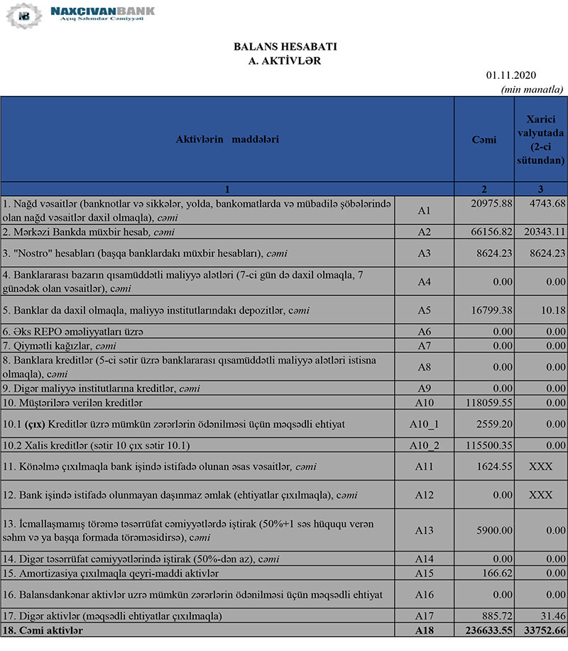 30 Sentyabr 2020-ci il tarixində "Naxçıvanbank” ASC 236 milyon 633 min manat cəmi aktivlərə, o cümlədən 118 milyon 59 min manat kredit portfelinə malik olub.