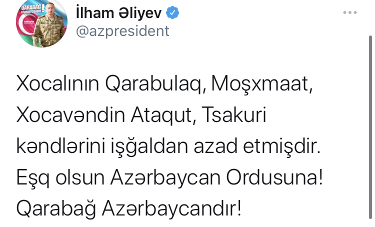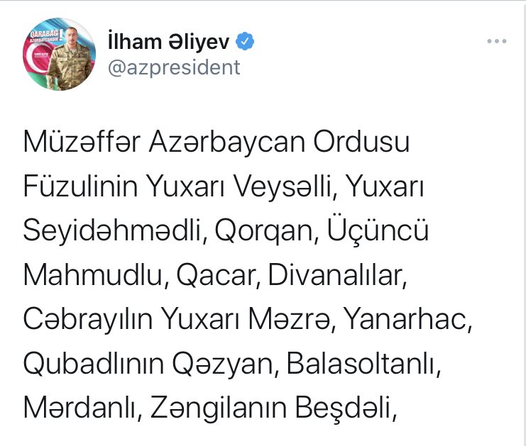 Daha 16 kənd işğaldan azad edilibMüzəffər Azərbaycan Ordusu Füzulinin Yuxarı Veysəlli, Yuxarı Seyidəhmədli, Qorqan, Üçüncü Mahmudlu, Qacar, Divanalılar, Cəbrayılın Yuxarı Məzrə, Yanarhac, Qubadlının Qəzyan, Balasoltanlı, Mərdanlı, Zəngilanın Beşdəli, Xocalının Qarabulaq, Moşxmaat, Xocavəndin Ataqut, Tsakuri kəndlərini işğaldan azad etmişdir. Eşq olsun Azərbaycan Ordusuna! Qarabağ Azərbaycandır!