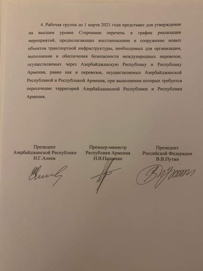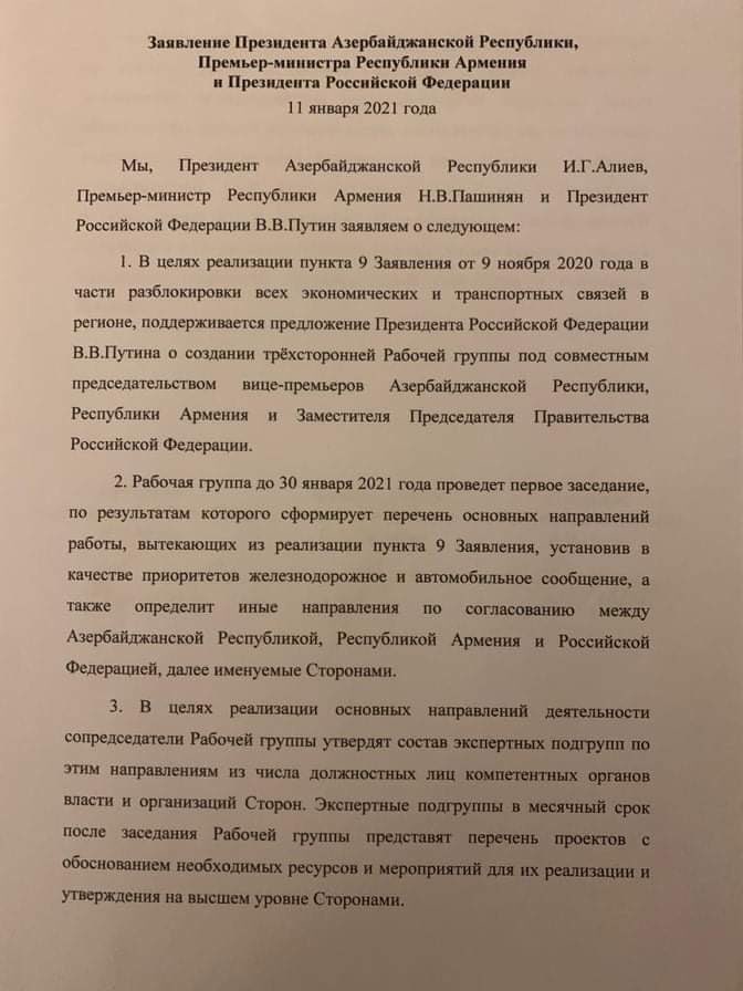 1. 2020-ci il 9 noyabr tarixli Bəyanatın 9-cu bəndinin regionda bütün iqtisadi və nəqliyyat əlaqələrinin bərpası ilə bağlı hissəsinin reallaşdırılması məqsədilə Rusiya Federasiyasının Prezidenti V.V.Putinin Azərbaycan Respublikasının, Ermənistan Respublikasının baş nazirləri müavinlərinin və Rusiya Federasiyası Hökumətinin sədr müavininin birgə həmsədrliyi ilə üçtərəfli İşçi qrupu yaradılması barədə təklifi dəstəklənir.