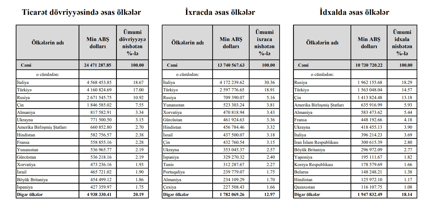 Ötən il Azərbaycan 3 ölkədən, hər birindən 1 milyard dollardan çox dəyərdə mallar idxal edib.