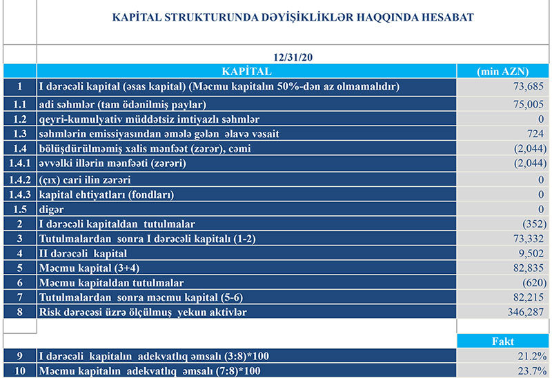 31 Dekabr 2020-ci il tarixində “Turanbank” 82 milyon 215 min manat məcmu kapitala malik olub. 2019-cu ilin sonunda “TuranBank” 76 milyon 821 min manat məcmu kapitala malik idi.