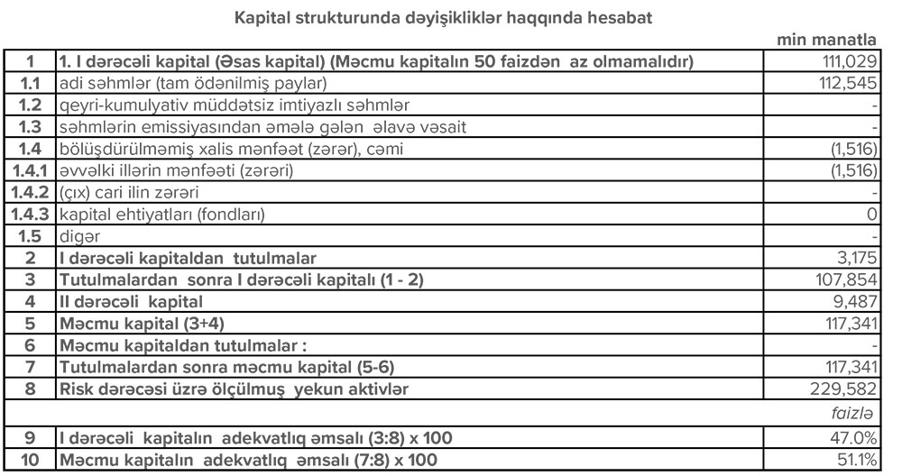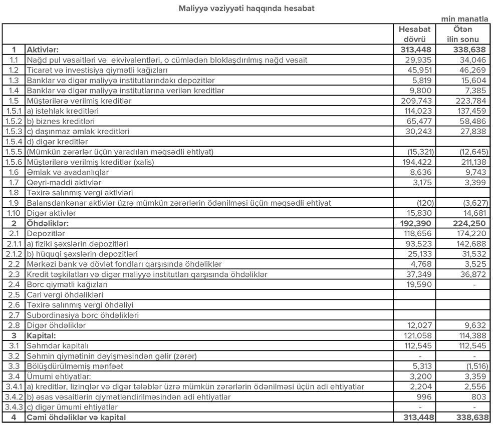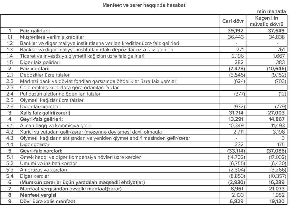 Bankın faiz gəlirliyi ötən ilin müvafiq dövrü ilə müqayisədə 4% artaraq 39.2 milyon manat, hüquqi şəxs və fərdi sahibkarlar üzrə haqq və komissiya gəlirləri isə 22% artaraq 3.7 milyon manat təşkil edib.