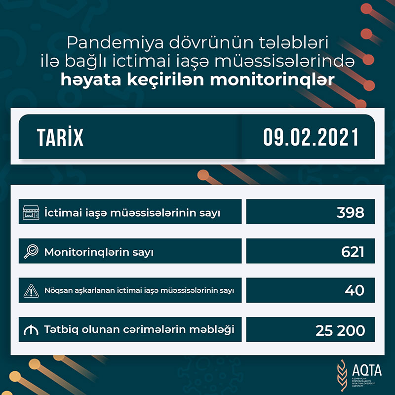 Nəzarət tədbirləri çərçivəsində 9 fevral 2021-ci il tarixində ölkə üzrə 398 ictimai iaşə obyektində 621 monitorinq keçirilib. Monitorinqlər zamanı 40 müəssisədə qanunvericiliyin tələblərinin kobud şəkildə pozulması faktları aşkar olunub. Aşkar olunmuş nöqsanlarla bağlı İnzibati Xətalar Məcəlləsinin müvafiq maddələrinə uyğun olaraq ümumilikdə 25 200 manat məbləğində cərimə tətbiq olunub.