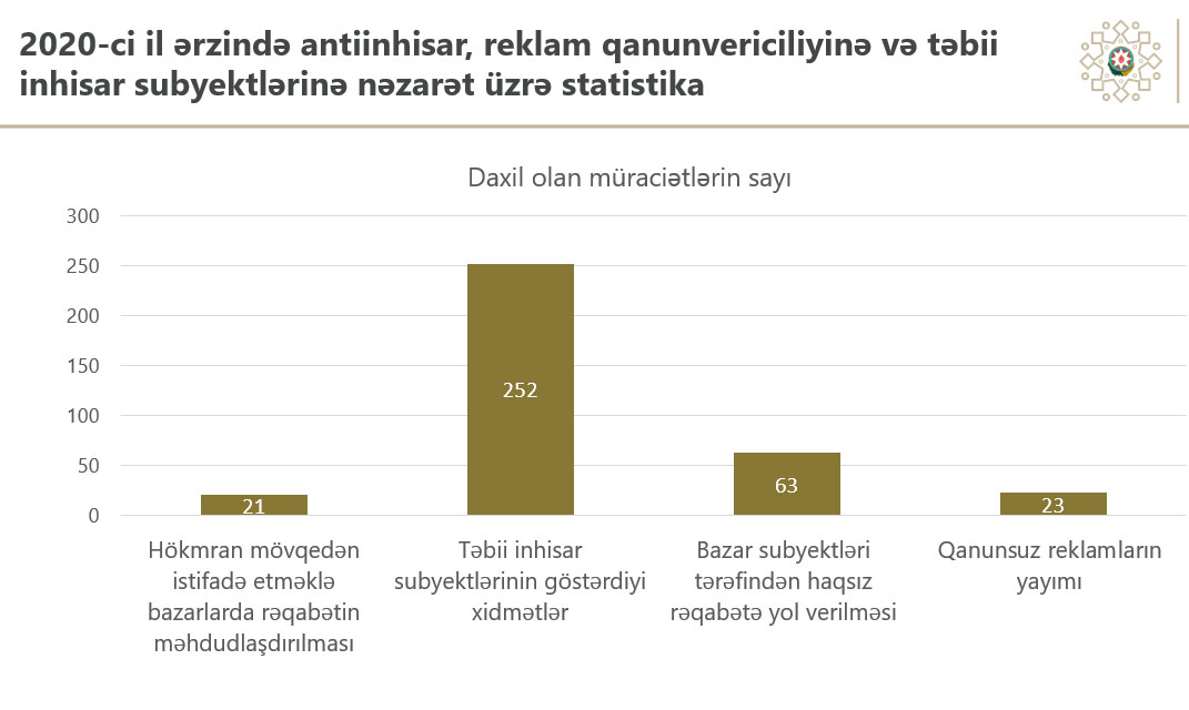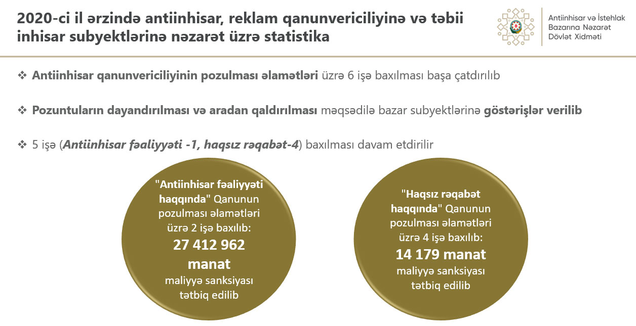 2020-ci il ərzində "Antiinhisar fəaliyyəti haqqında" Qanunun pozulması əlamətləri üzrə 2 işə baxılıb və 27 milyon 412 min 962 manat maliyyə sanksiyası tətbiq edilib.