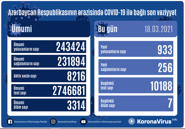 Azərbaycanda indiyədək ümumilikdə 243424 nəfər koronavirus infeksiyasına yoluxub. Onlardan 231894 nəfər müalicə olunaraq sağalıb, 3314 nəfər vəfat edib, aktiv xəstə sayı 8216 nəfərdir.