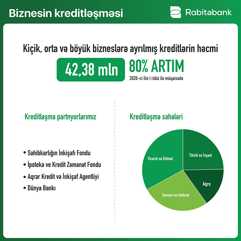 “Rabitəbank”ın verdiyi kreditlərdə də artım müşahidə olunur. Gündəlik biznes kreditlərinin verilməsi həcmi 14.5% artıb. İlin ilk rübündə kiçik və orta biznesin kredit portfelini 12%, mikrokreditləri isə 20% artırmağa müvəffəq olub. Qeyd edək ki, verilmiş kreditlərin 58%-i ölkə üçün əhəmiyyətli real sektorun kreditləşməsinə yönəldilib.