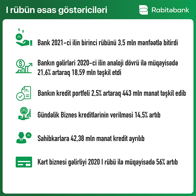 “Rabitəbank” ilin birinci rübünü mənfəətlə başa vurubÖlkənin aparıcı banklarından olan “Rabitəbank” 2021-ci ilin ilk rübü üzrə maliyyə göstəricilərini açıqlayıb.