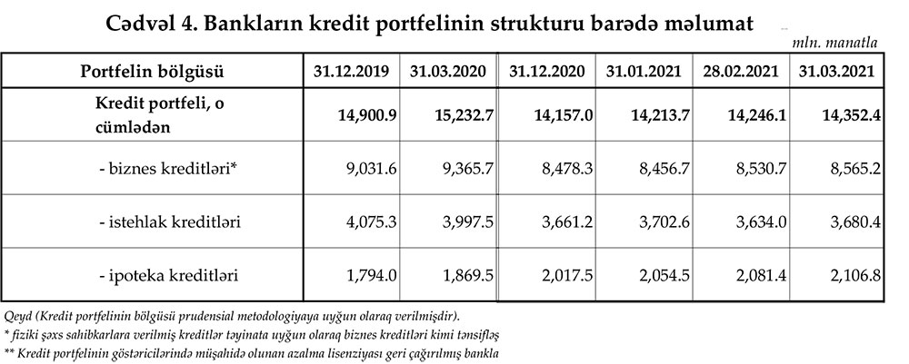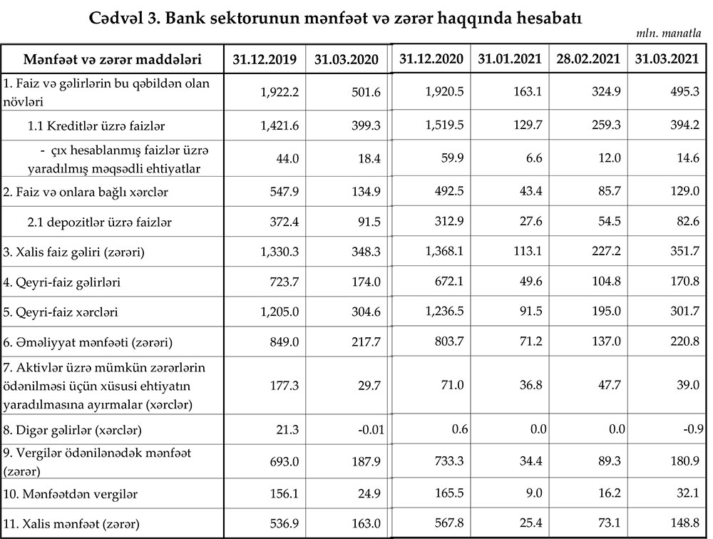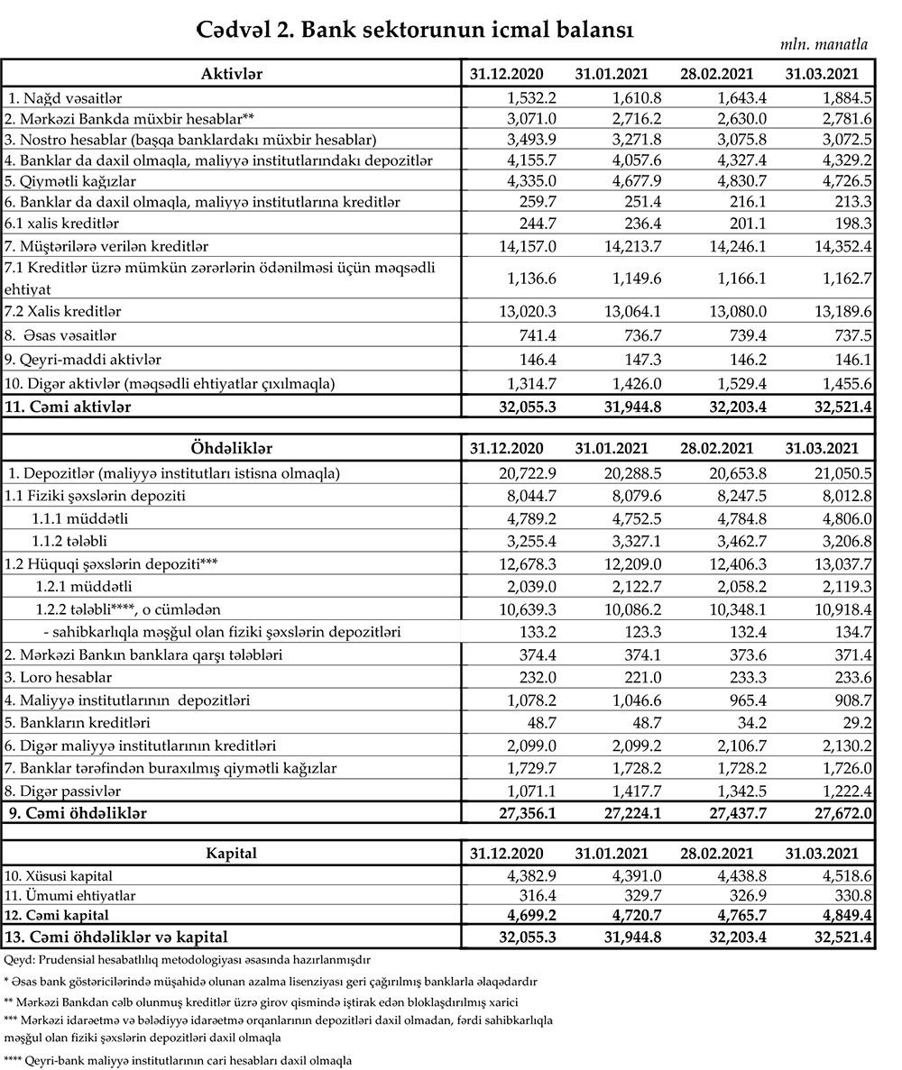 31 mart 2021-ci il tarixinə olan bank sektorunun əsas göstəriciləri açıqlanıb.