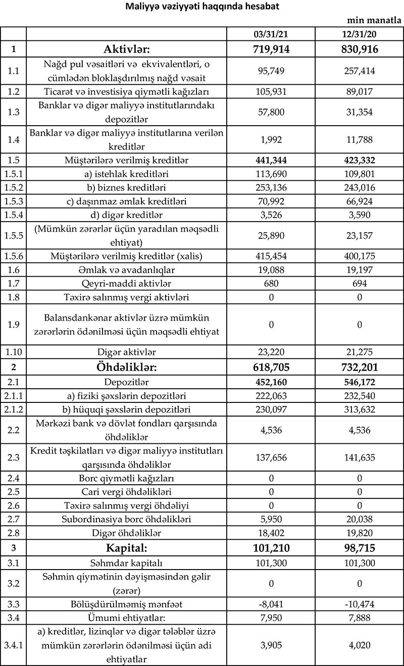 Müqayisə üçün qeyd edək ki, 2020-ci ilin ilk rübündə “Rabitəbank”ın cəmi əməliyyat gəlirləri 14 milyon 741 min manat, cəmi əməliyyat xərcləri 10 milyon 491 min manat, əməliyyat mənfəəti 4 milyon 250 min manat təşkil etmişdi. Bank əməliyyat mənfəətindən 3 milyon 121 min manat mümkün zərərlər üçün yaradılan məqsədli ehtiyatlara ayırdığından həmin dövrü 1 milyon 129 min manat xalis mənfəət ilə başa vurmuşdu.