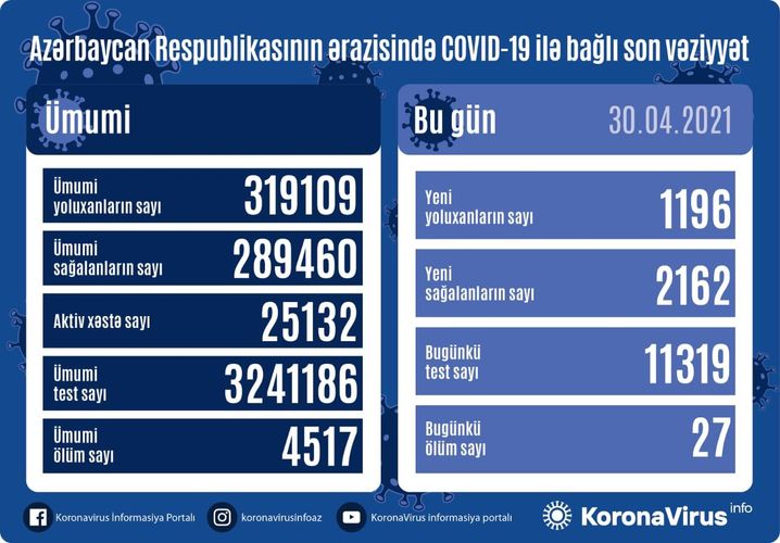 Son sutka ərzində yeni yoluxma hallarının müəyyənləşdirilməsi ilə əlaqədar 11 319, ötən müddət ərzində isə ümumilikdə 3 241 186 test aparılıb.