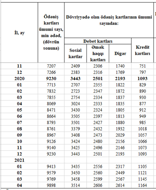 İlk 4 ayda (yanvar-aprel dövründə) sosial kartların sayı 71 min ədəd, əməkhaqqı kartlarının sayı 105 min ədəd, sosial və əməkhaqqı kartı olmayan digər debet kartlarının sayı 421 min ədəd, kredit kartlarının sayı isə 71 min ədəd artıb.
