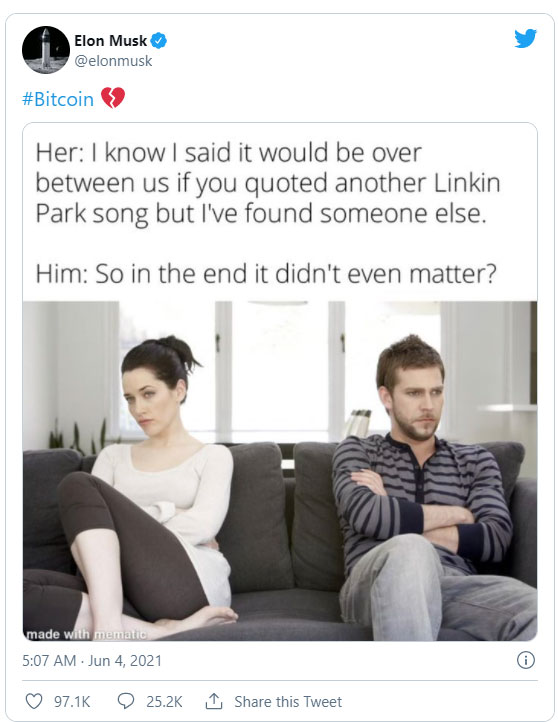 Marja xəbər verir ki, Maskın Twitter hesabından qırıq ürək emojisi ilə (piktoqraf, simvol) Bitcoin paylaşımı etməsi kriptovalyutanın 37 min dollar səviyyələrinə düşməsinə səbəb olub.