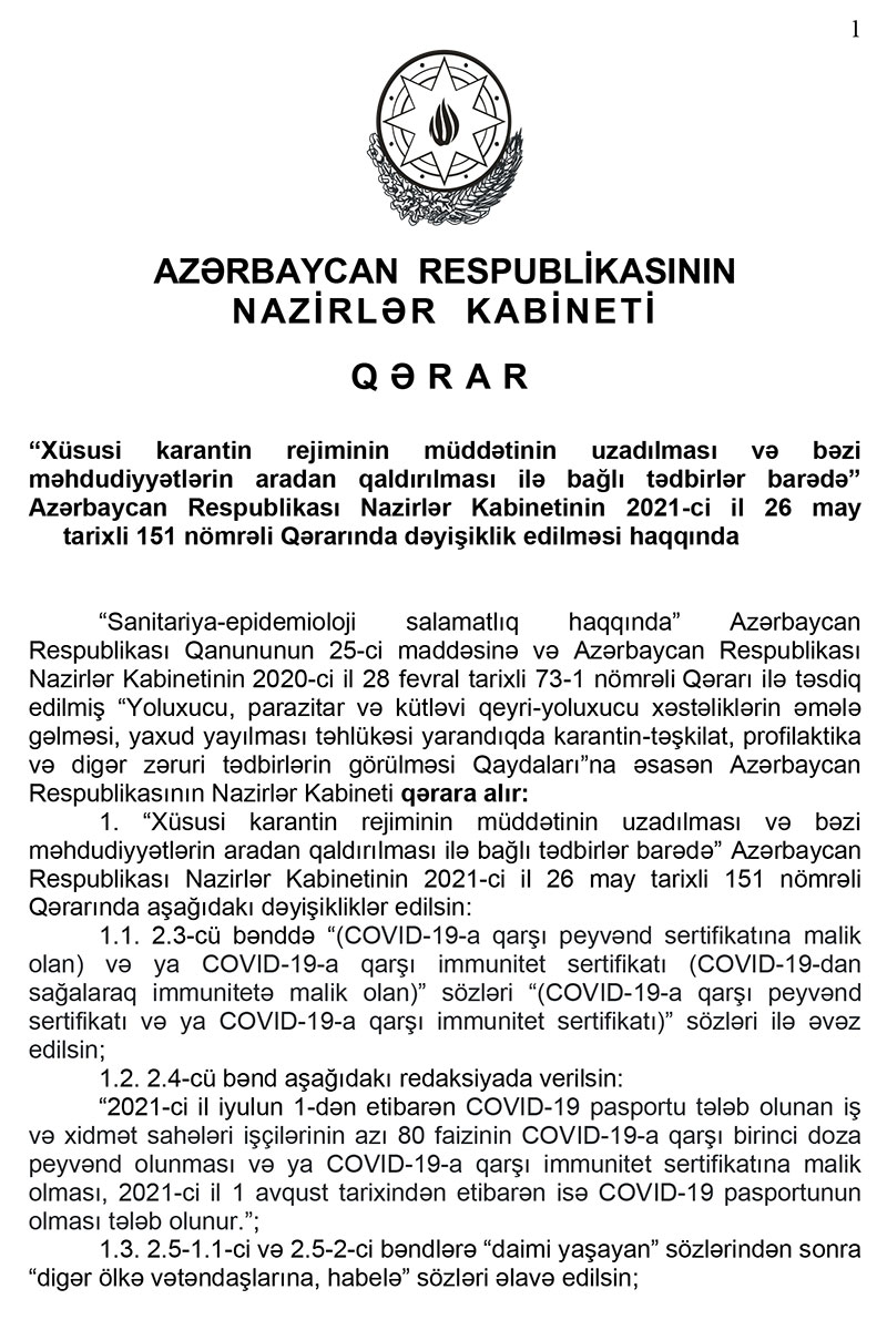 - Nazirlər Kabinetinin 2021-ci il 26 may tarixli 151 nömrəli Qərarına əsasən 2021-ci il iyulun 1-dən etibarən COVİD-19 pasport tələbi tətbiq olunan məkanlarda çalışan işçi heyətin (müvəqqəti işə cəlb edilmiş işçilər daxil olmaqla) azı 80 faizinin COVID-19 pasportuna malik olması mütləqdir (1 avqustadək birinci doza qeyd olunmuş vaksinasiya sertifikatı qəbul eilir). Şənlik mərasimində xidmət göstərən heyətin (musiqiçilər istisna olmaqla) tibbi maskalardan, əlcəklərdən və digər fərdi qoruyucu vasitələrdən istifadəsi məcburidir.