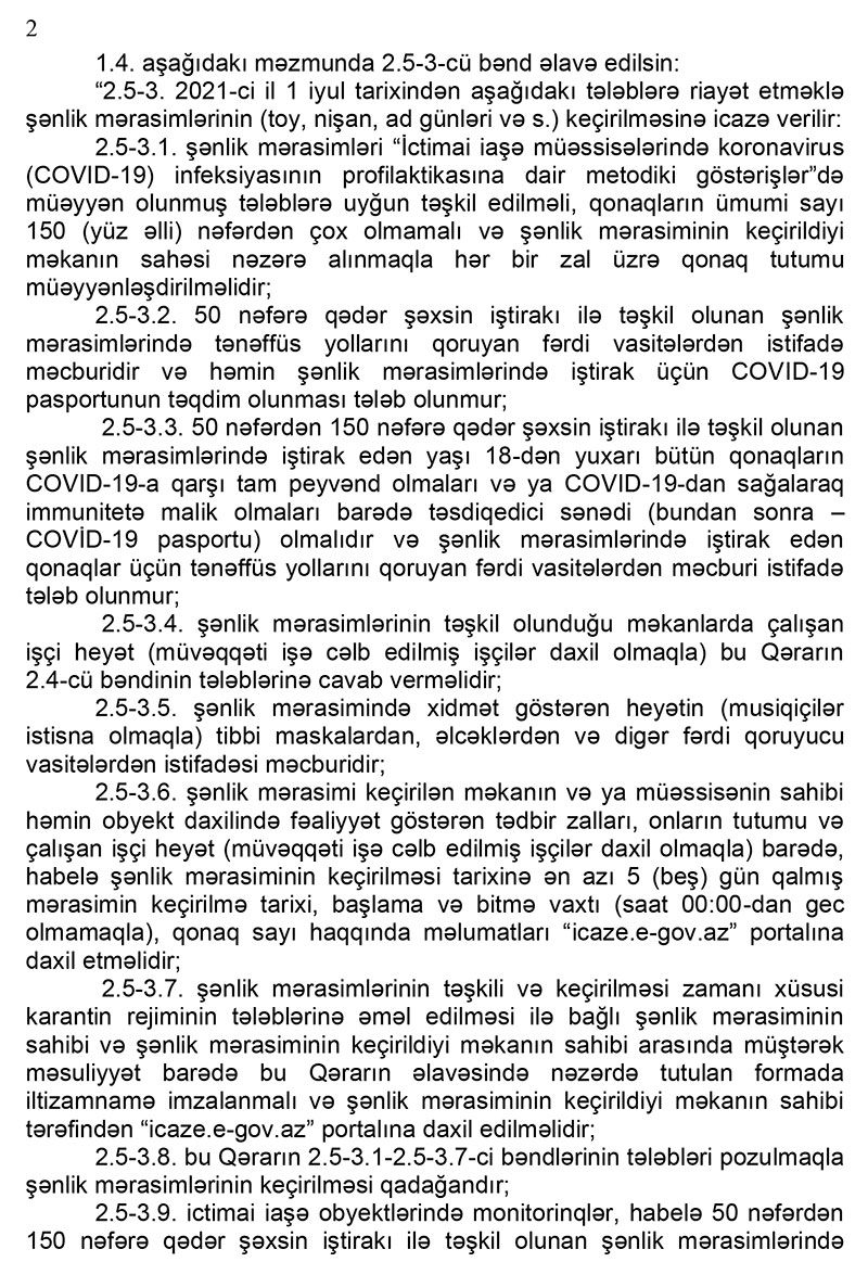 - yaşı 18-dən yuxarı olan bütün şəxslərin iştirakına yalnız COVID-19-a qarşı tam peyvənd olunması və ya COVID-19-dan sağalaraq immunitetə malik olması barədə təsdiqedici sənəd (bundan sonra – COVİD-19 pasportu) olduğu halda icazə verilir və şənlik mərasimlərində iştirak edən qonaqlar üçün tənəffüs yollarını qoruyan fərdi vasitələrdən məcburi istifadə tələbi ləğv edilir;