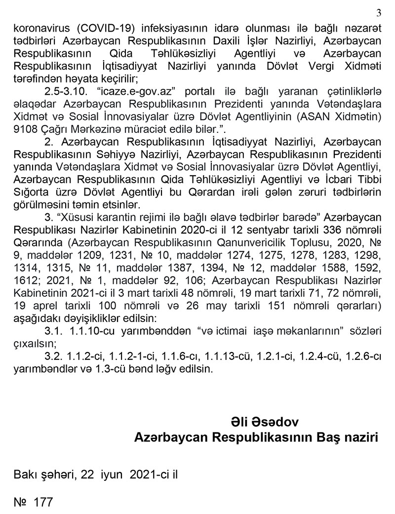 “Xüsusi karantin rejiminin müddətinin uzadılması və bəzi məhdudiyyətlərin aradan qaldırılması ilə bağlı tədbirlər barədə” Nazirlər Kabinetinin qərarında dəyişiklik edilib.