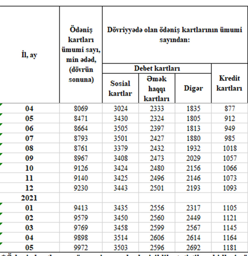 May ayında sosial kartların sayı 11 min ədəd azalaraq 3 milyon 503 min ədədə, əməkhaqqı kartlarının sayı 10 min ədəd azalaraq 2 milyon 596 min ədədə düşüb, sosial və əməkhaqqı kartı olmayan digər debet kartlarının sayı 78 min ədəd artaraq 2 milyon 692 min ədədə, kredit kartlarının sayı isə 17 min ədəd artaraq 1 milyon 181 min ədədə çatıb.