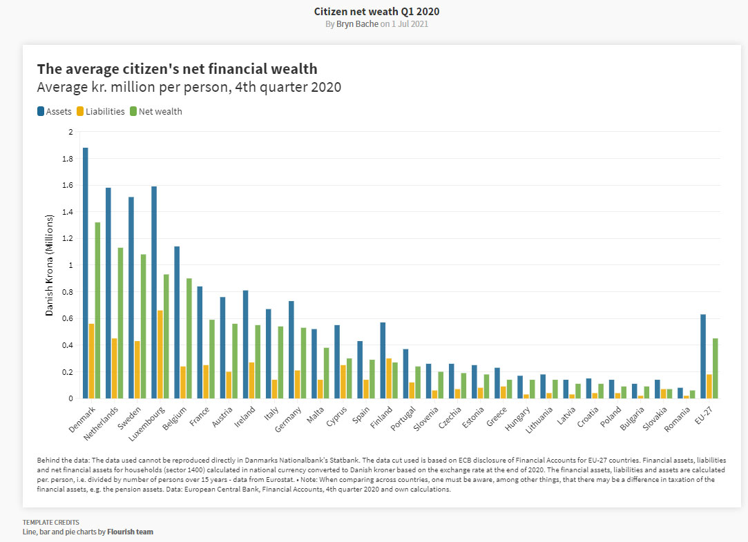 Ev təsərrüfatlarının orta sərvəti və aktivlərinə görə Danimarka Avrozonada liderlik edir. Burda borc öhdəlikləri çıxıldıqdan sonra hər evə təxminən 1,32 milyon Danimarka kronu (210 min 259 dollar) sərvət düşür. Bu isə 27 üzvü olan Avropa İttifaqında orta göstəricinin (450 min kron) təxminən üç qatıdır.