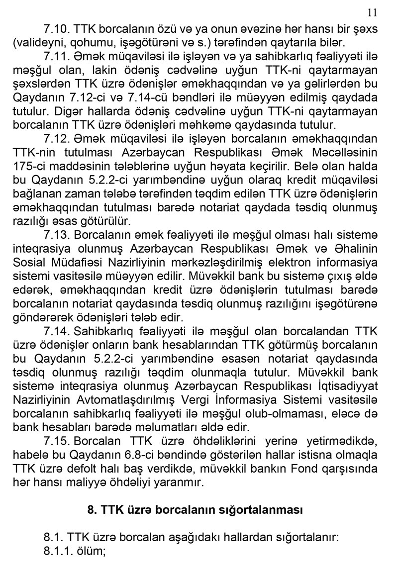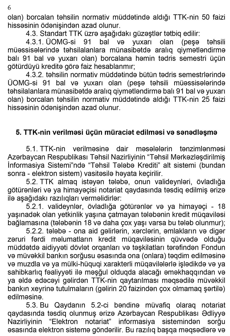 - tələbə - ona aid gəlirlərin, xərclərin, əmlakların və digər zəruri fərdi məlumatların kredit müqaviləsinin qüvvədə olduğu müddətdə aidiyyəti dövlət orqanları və təşkilatları tərəfindən Fondun və müvəkkil bankın sorğusu əsasında ona (onlara) təqdim edilməsinə və muzdla və ya mülki-hüquqi xarakterli müqavilələrlə işlədikdə və ya sahibkarlıq fəaliyyəti ilə məşğul olduqda alacağı əməkhaqqından və ya əldə edəcəyi gəlirdən TTK-nin qaytarılması məqsədilə müvəkkil bankın xeyrinə tutulmaların (gəlirin 20 faizindən çox olmamaq şərtilə) edilməsinə.