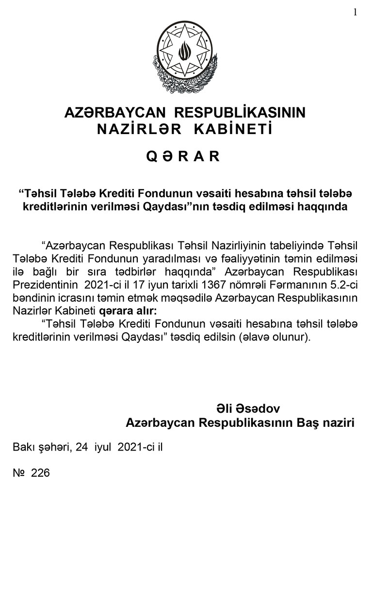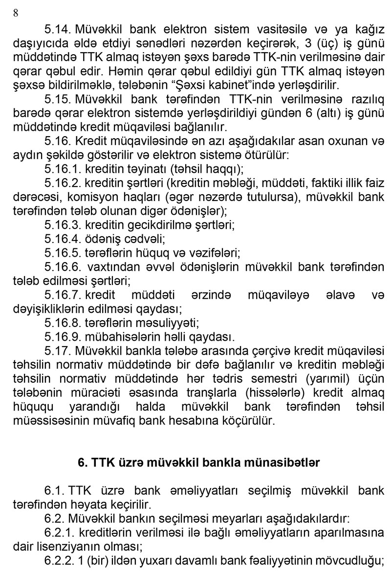- Müvəkkil bankla tələbə arasında çərçivə kredit müqaviləsi təhsilin normativ müddətində bir dəfə bağlanılır və kreditin məbləği təhsilin normativ müddətində hər tədris semestri (yarımil) üçün tələbənin müraciəti əsasında tranşlarla (hissələrlə) kredit almaq hüququ yarandığı halda müvəkkil bank tərəfindən təhsil müəssisəsinin müvafiq bank hesabına köçürülür.