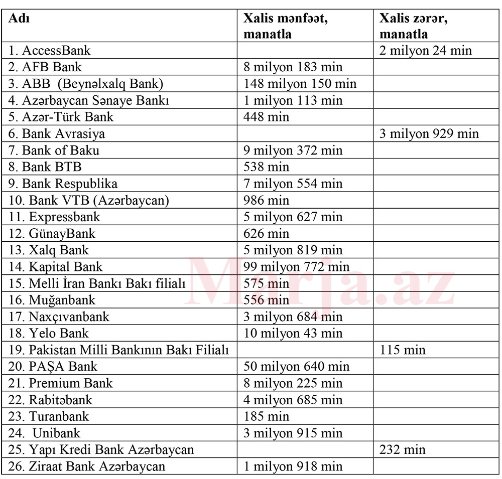 2021-ci ilin ilk yarısında ABB 148 milyon 150 min manat, PAŞA Bank 50 milyon 640 min manat, Kapital Bank 99 milyon 772 min manat, Xalq Bank 5 milyon 819 min manat, Bank Respublika isə 7 milyon 554 min manat xalis mənfəət əldə edib.