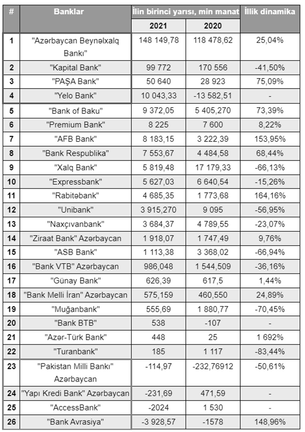Bankların dərc etdiyi məlumatlar əsasında aparılan hesablamalara görə, banklar əsasən bu ilin birinci yarısında mənfəət əldə ediblər, lakin bəzi banklar mənfəətlərini artıra bilməyib, digərləri isə ümumiyyətlə, keçən ilin eyni dövrünün tendensiyasını davam edərək zərərlə işləyiblər.