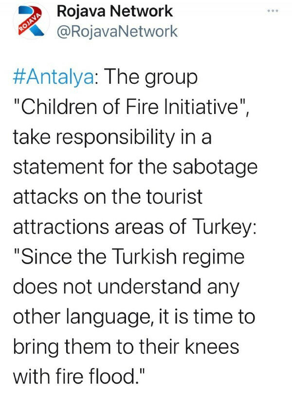 Türkiyənin cənub bölgələrində başlayan meşə yanğınlarına görə məsuliyyəti PKK terror təşkilatına bağlı olan “Atəşin uşaqları təşəbbüsü” qrupu üzərinə götürüb.
