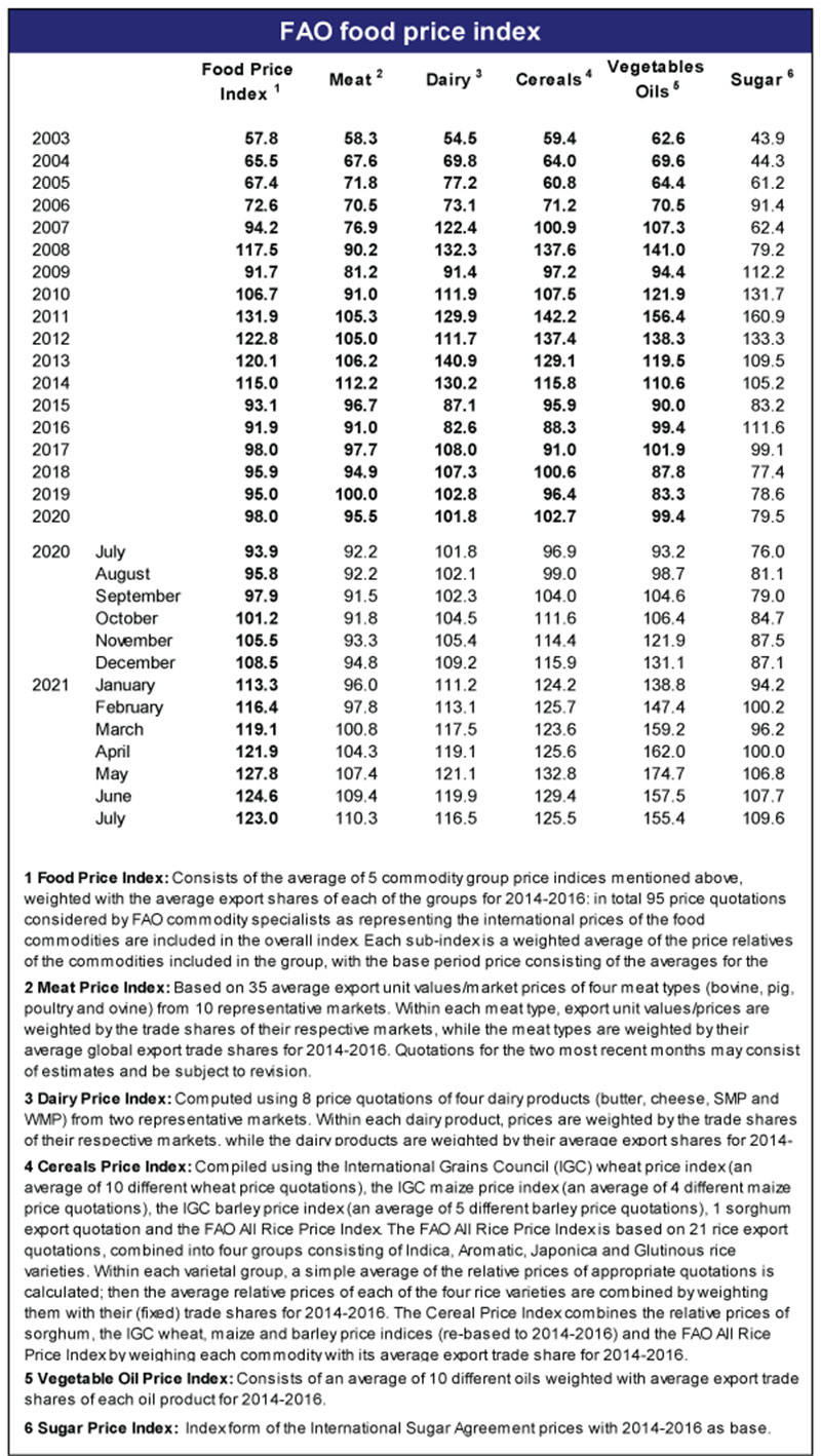 FAO Taxıl Qiymət İndeksi, Braziliyadakı iqlim şərtləri bir narahatlıq qaynağı olmağa davam etsə belə, Argentinada nəzərdə tutulandan daha yaxşı olan məhsul və ABŞ-da artan istehsal gözləntiləri ilə əlaqəli olaraq beynəlxalq qarğıdalı qiymətlərindəki aylıq 6%-lik azalmanın təsirilə İyulda aylıq müqayisədə 3,8% geriləyib. Ancaq İndeks, keçən ilin eyni dövrü ilə müqayisədə hələ də 29,6% yüksəkdir.