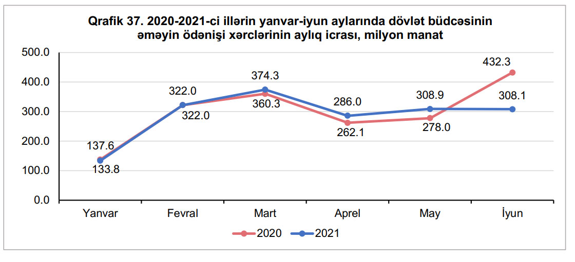 2021-ci ilin yanvar-iyun aylarında dövlət büdcəsinin əməyin ödənişi xərcləri 2020-ci ilin müvafiq dövrü ilə müqayisədə 3,3 faiz və ya 59,3 milyon manat azalaraq 1 milyard 733,1 milyon manat icra edilmişdir.