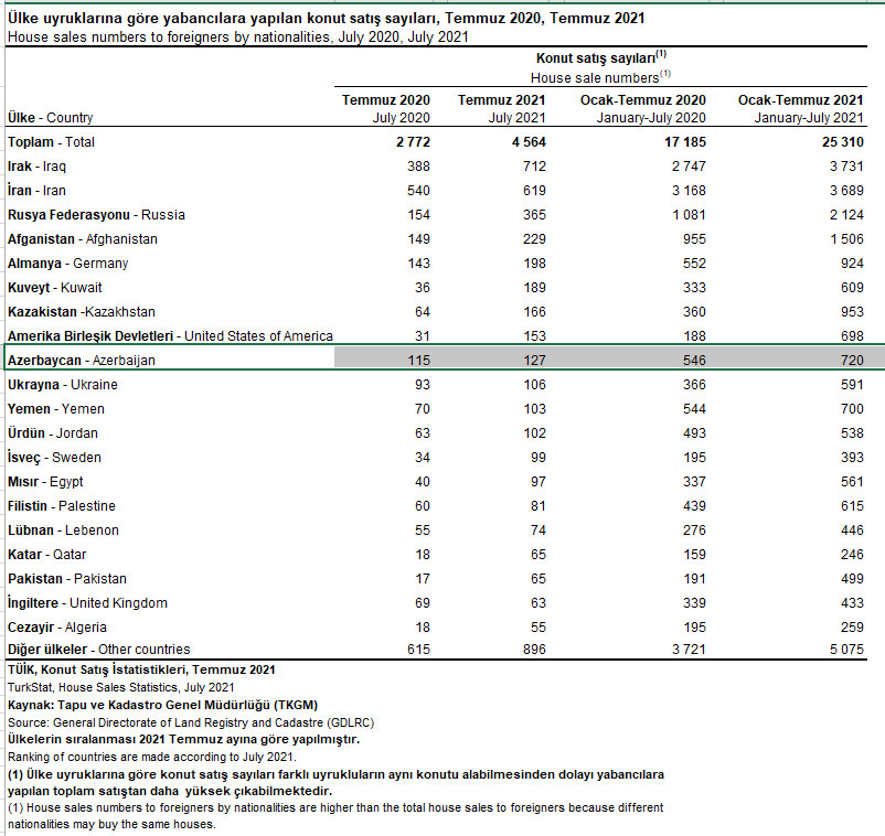 2021-ci ilin yanvar-iyul aylarında (7 ay ərzində) azərbaycanlılar Türkiyədə 720 mənzil alıblar. 2020-cu ilin eyni dövründə azərbaycanlılar Türkiyədə 546 mənzil almışdılar.