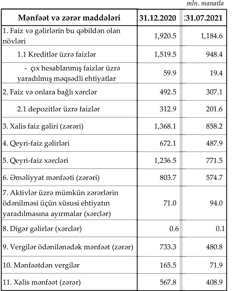 Azərbaycanın bank sektoru 2021-ci ilin 7 ayını 408,9 milyon manat xalis mənfəət ilə başa vurub. Ötən ilin eyni dövründə sektorun xalis mənfəəti 428,1 milyon manat təşkil etmişdi.