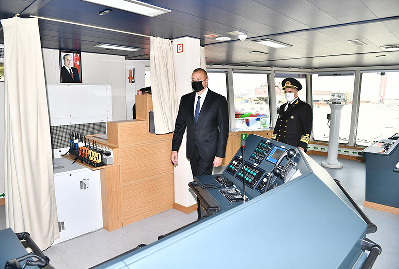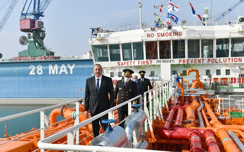 Dövlətimizin başçısı tankerin istifadəyə verilməsini bildirən rəmzi lenti kəsib.