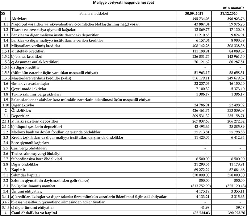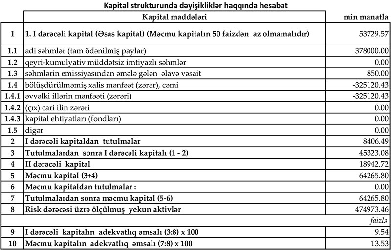 Hesabat dövrü üzrə bankın xalis faiz gəlirləri 32.9 milyon manat təşkil edib. Hazırda Bankın məcmu kapitalı 64.3 mln manatdır, bu göstərici requlyativ tələbdən 14.3 mln manat çoxdur.