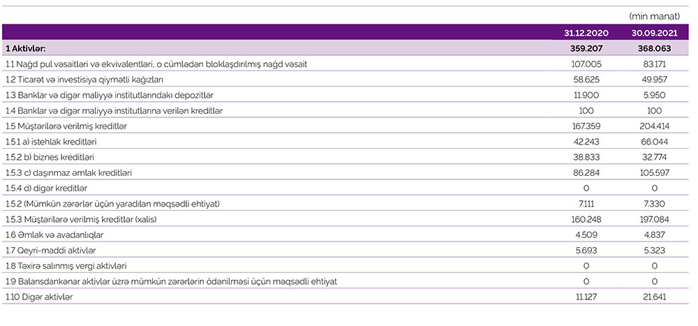 Azər Türk Bankın cəmi aktivləri 2021-ci ilin 9 ayında ötən ilin sonu ilə müqayisədə 8 milyon 856 min manat və ya 2,5% artaraq 368 milyon 63 min manata, müştərilərə verilmiş kreditlər isə 37 milyon 55 min manat və ya 22,1% artaraq 204 milyon 414 min manata çatıb. Bankın istehlak kreditləri portfeli 23 milyon 801 min manat artaraq 66 milyon 44 min manata, ipoteka krediti portfeli 19 milyon 313 min manat artaraq 105 milyon 597 min manata yüksəlib, biznes kreditləri portfeli isə 6 milyon 59 min manat azalaraq 32 milyon 774 min manata düşüb.