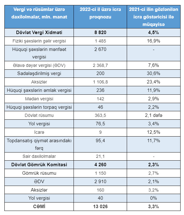 Maliyyə Nazirliyinin 2022-ci il üçün dövlət və icmal büdcələri üzrə layihələrində verilən məlumata görə, nəticədə, 2022-ci ildə ümumilikdə vergi və rüsumlardan 13 milyard 26 milyon manat vəsaitin dövlət büdcəsinə daxil olacağı nəzərdə tutulub. Bu, 2021-ci ilin gözlənilən icra göstəricisi ilə müqayisədə 3,3% çoxdur.