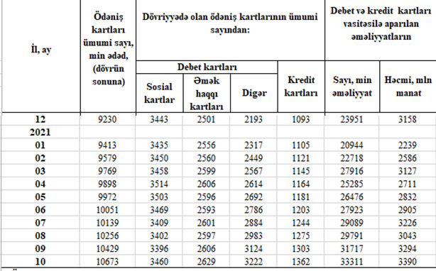 Cari ilin 10 ayı ərzində (yanvar-oktyabr dövründə) sosial kartların sayı 17 min ədəd, əməkhaqqı kartlarının sayı 128 min ədəd, sosial və əməkhaqqı kartı olmayan digər debet kartlarının sayı 1 milyon 29 min ədəd, kredit kartlarının sayı isə 269 min ədəd artıb.