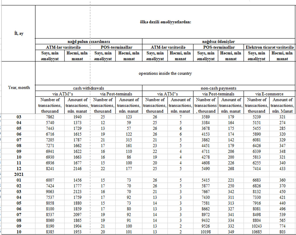 Marja Mərkəzi Banka istinadən xəbər verir ki, 2021-ci ilin 10 ayı ərzində (yanvar-oktyabr) ATM-lər ilə 32 milyon manat, POS-terminallar ilə 3 milyard 120 milyon manat və elektron ticarət vasitəsilə 5 milyard 218 milyon manat olmaqla cəmi 8 milyard 370 milyon manat nağdsız ödənişlər həyata keçirilib. Bu, 2020-ci ilin 12 ayındakı nağdsız ödənişlərdən (6 milyard 115 milyon manat) 2 milyard 255 milyon manat çoxdur. Nağdsız ödənişlər ötən ilin 10 ayı ilə müqayisıədə isə 73% artıb.