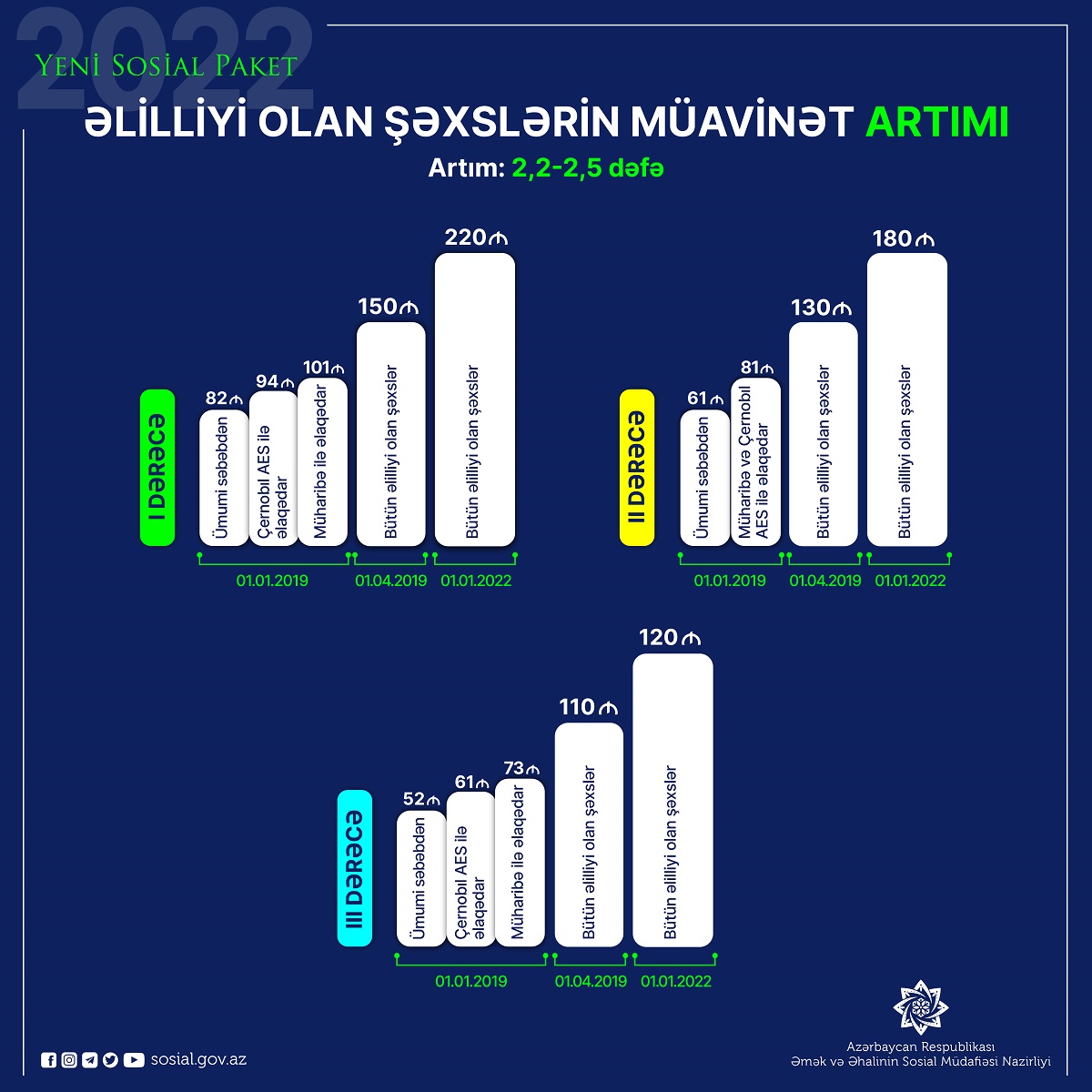 Beləliklə, müharibə və digər xüsusi səbəblərləəlaqədar əlilliyi olanlar pensiya almadıqda müavinət və təqaüd formasında ayda I dərəcə üzrə 700 manat, II dərəcə üzrə 530, III dərəcə üzrə 420 manat alacaqlar. Bu da 2019-cu illə müqayisədə dərəcələr üzrə müvafiq olaraq 2,5 dəfə, 2,2 dəfə və 2,2 dəfə çoxdur.